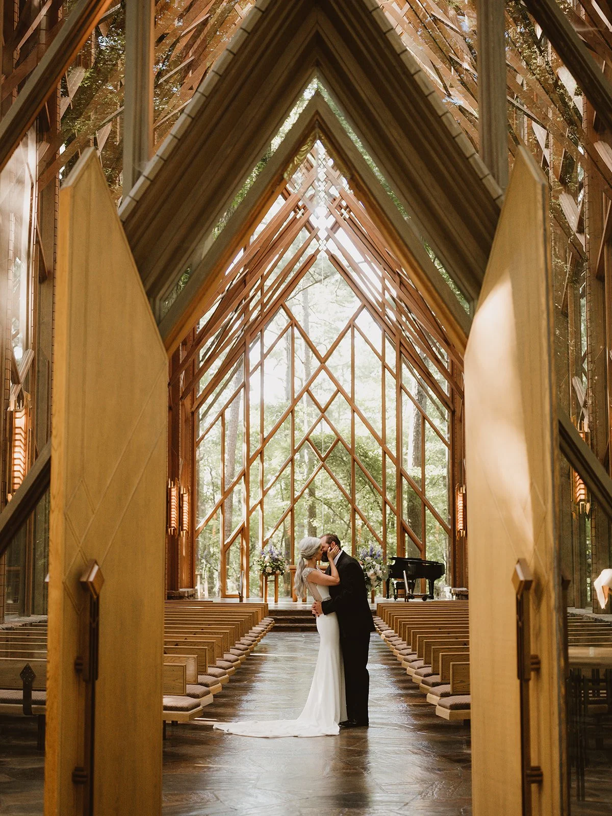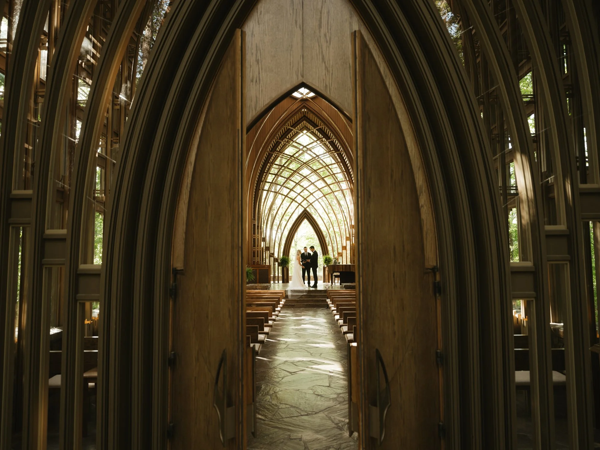 Arkansas is home to some stunning glass chapels that are perfect for elopements. These architectural marvels blend seamlessly with the natural surroundings. If you're looking for a unique and memorable venue, consider places like Thorncrown Chapel in Eureka Springs or Mildred B. Cooper Memorial Chapel in Bella Vista. Check this link below for a complete look at all of the chapels, the differences between them, the capacity they can hold, and photos from actual weddings at each!